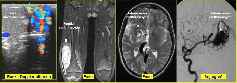 Tanı, görüntüleme: Cilde yakın olan malformasyonlarda en pratik yöntem renkli Doppler ultrasonografidir. Bu yöntemle malformasyonun yerleşimi, boyutları ve düşük akımlı mı yüksek akımlı mı olduğu ayırt edilebilir. Daha sonra genellikle MR yapılır. MR ile malformasyonların boyut, uzanım ve çevre dokularla ilişkisi daha iyi değerlendirilebilir. Ciltten derinde olan malformasyonlarda ise MR daha iyi bilgiler verir. Ancak düşük-yüksek akım ayrımı için genellikle renkli Doppler yapmak gerekir.