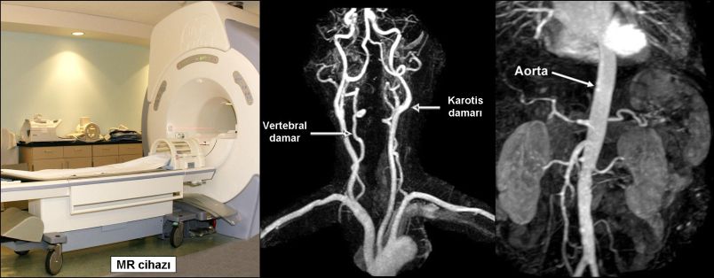 MR (Emar) anjiografi: MR anjiografide, hasta tüp şeklinde büyük bir mıknatısın içine yatırılarak manyetik alan ve radyo dalgalarından yararlanılarak damarlar görüntülenir. Hastaya hiç ilaç vermeden bile damarlar görüntülenebilir, ancak son yıllarda kol toplardamarından ilaç verilmesi tercih edilmektedir. MR ile vücuttaki tüm damarlar görüntülenebilir. Özellikle ultrasonografinin iyi gösteremediği beyin, göğüs ve karın bölgesindeki damarlar da çok iyi incelenebilir. Ayrıca tüm damarlar üç boyutlu olarak istenilen açıdan değerlendirilebilir.