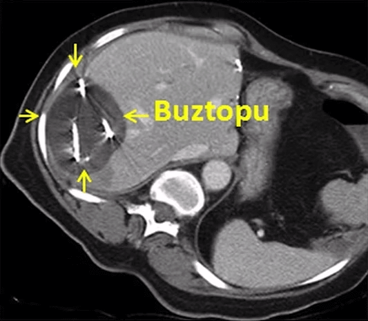İşlem sırasında çekilen tomografide kriyoabalasyonun oluşturduğu buztopu izleniyor.