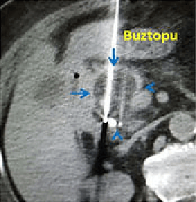 Pankreas başı kanseri (kırmızı oklar) olan hastamıza 2 probla kriyoablasyon yapılıyor.