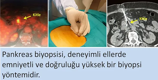 Pankreas biyopsisi ultrason ya da tomografi rehberliğinde yapılabilir. Kitle hangisiyle daha iyi görülüyorsa o görüntüleme yöntemi tercih edilmelidir. Biyopsi için önce bir kılavuz iğne ile pankreastaki kitleye kadar ilerlenir ve daha sonra daha ince bir kesici biyopsi iğnesi ile kitleden çok sayıda biyopsi alınır. Kılavuz iğnenin pankreas çevresindeki damarlardan, kalın barsaktan ve mümkünse mide ve ince barsaktan da geçmemesine dikkat edilmelidir. Bunun için tomografi ve ultrasonda bu yapıların iyi görüntülenmesi önemlidir. Deneyimli ellerde, pankreas biyopsisi yaklaşık 10 dakikalık bir sürede tamamlanabilen, emniyetli ve ağrısız bir işlemdir.