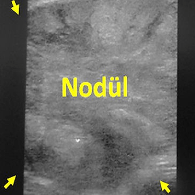 Tiroid bezinin istmus bölgesinde 72x53x47 mm dev nodülü olan 70 yaşında kadın hastamızda nodüle ultrason eşliğinde mikrodalga ablasyonu uygulandı. Bir yıl sonra hastanın boyun şişliği ortadan kalkmış ve ultrasonda nodülde %90’dan fazla bir hacim azalması izlenmiştir.”