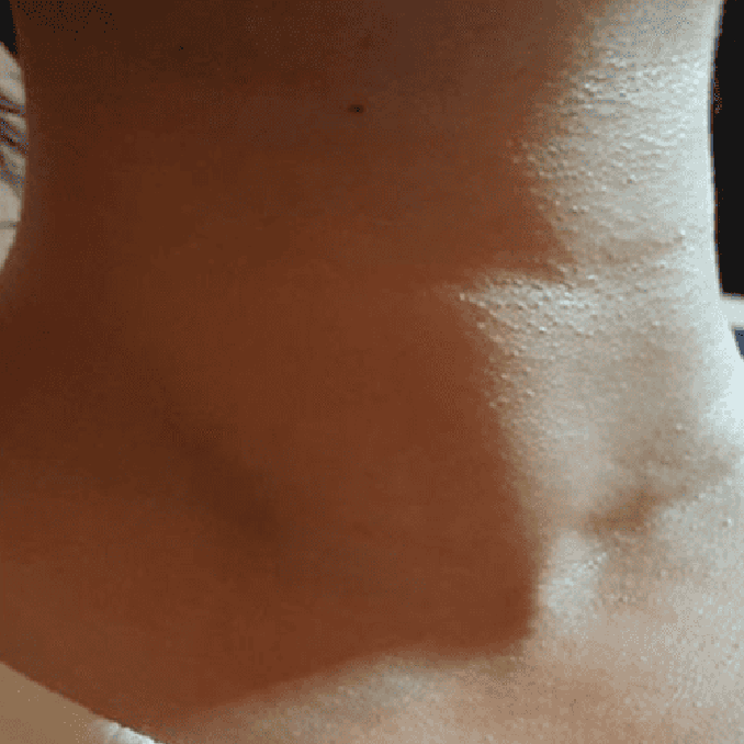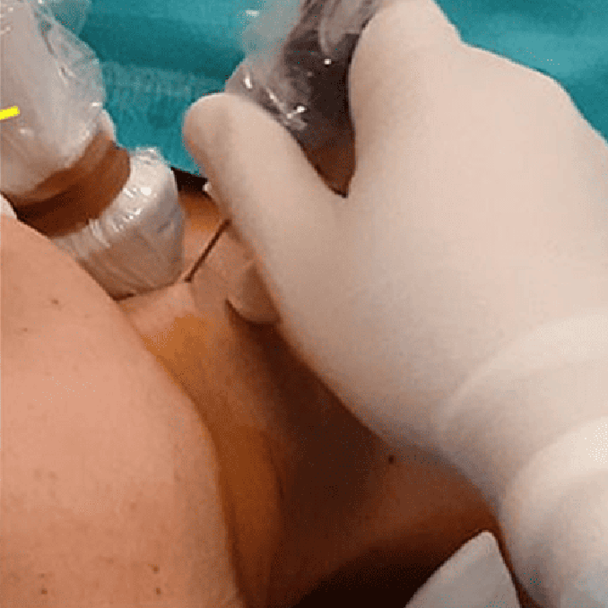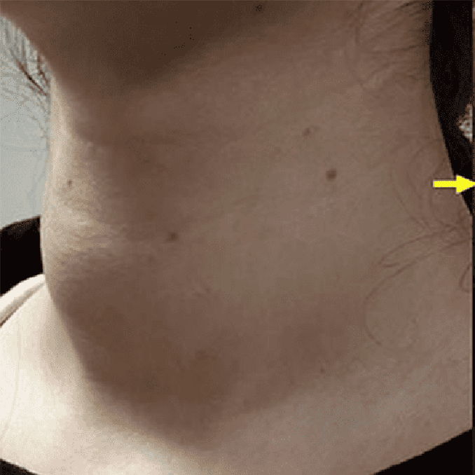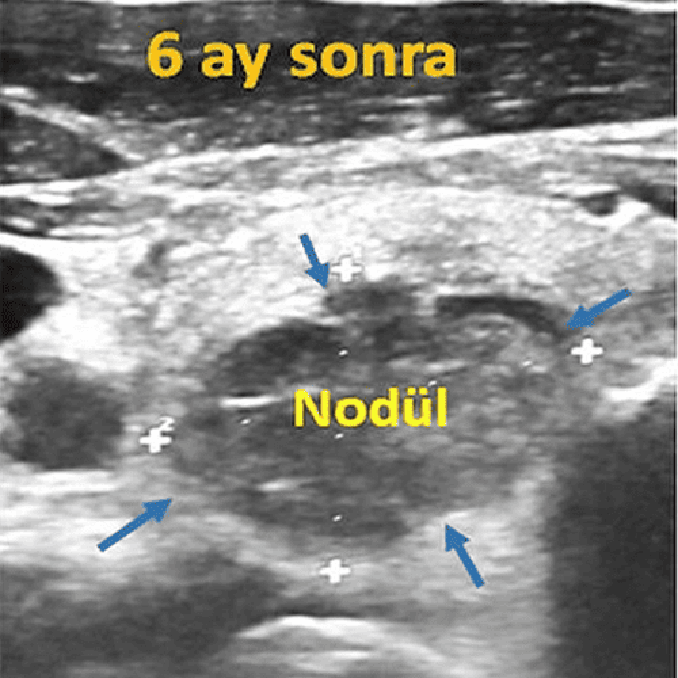 Tiroid sağ lobunda 51x30x37 mm boyutlarında solid nodülü olan hastamızda ultrason rehberliğinde perkütan lazer ablasyonu uygulandı. Bir yıl sonra, tedavi edilen nodül hacimsel olarak % 80 oranında küçülmüş ve boyun görünümü normale dönmüştür.