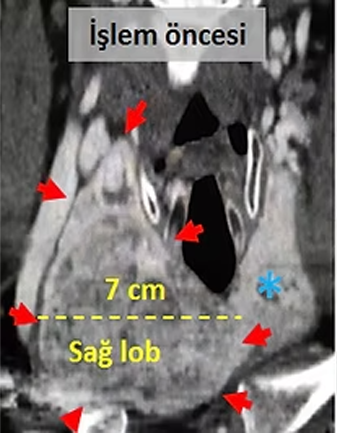 Boynunda dışa doğru büyüyen dev guatr sorunu olan 41 yaşındaki erkek hastamızda, önce anjiografi tekniğiyle embolizasyon yapılarak guatr dokusunu besleyen damarlar tıkanıyor. Daha sonra da 2 kez alkol ablasyonu yapılıyor. Bir yıl sonra boyundaki guatr kitlesinin %90 dan fazla küçüldüğü izleniyor. Bu tür hastalarda, guatr daki küçülme sonraki yıllarda da devam etmektedir.