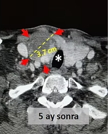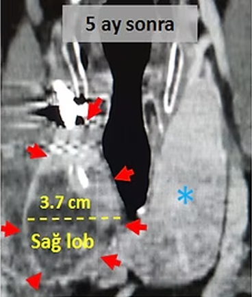 Embolizasyondan 5 ay sonra çekilen kontrol tomografilerinde, embolizasyon uygulanan sağ lobun hacimsel olarak yaklaşık %80 küçüldüğü, büyük nodülün çapının 7cm den 3.7cm ye düştüğü (hacimsel olarak %86 azalma), sağlam olan sol lobun (*) büyüdüğü ve kitlelerin soluk borusuna soluk borusuna (*) yaptığı basının azaldığı izleniyor. Hastada, boyundaki şişlik ortadan kalkmış ve işlemden bir ay sonra nefes darlığı tamamen düzelmiştir.