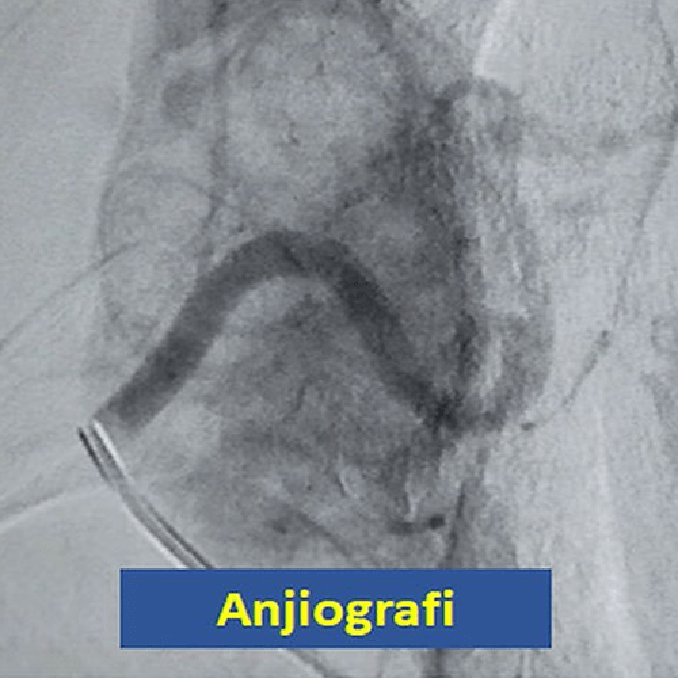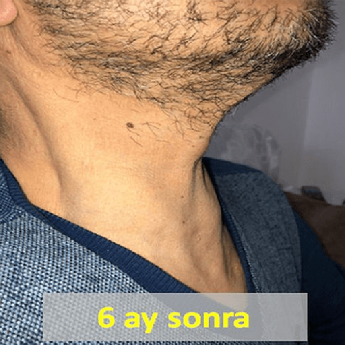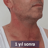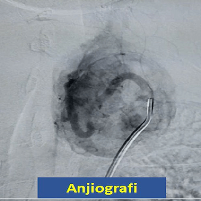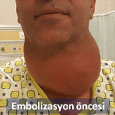 Sağ tiroid lobunda 7 cm çaplı iyi huylu solid nodülü olan 50 yaşındaki erkek hastamıza embolizasyon uygulandı. Beş ay sonra, kontrol tomografilerinde nodülün çapının 7 cm’den 3.7 cm’ye izlenmiştir (hacimsel olarak %86 küçülme). Yakınmaları ortadan kalkan hastada boynun görünümü de tamamen normale dönmüştür.