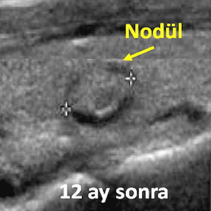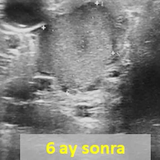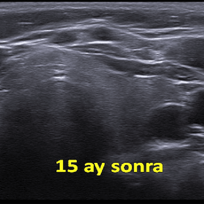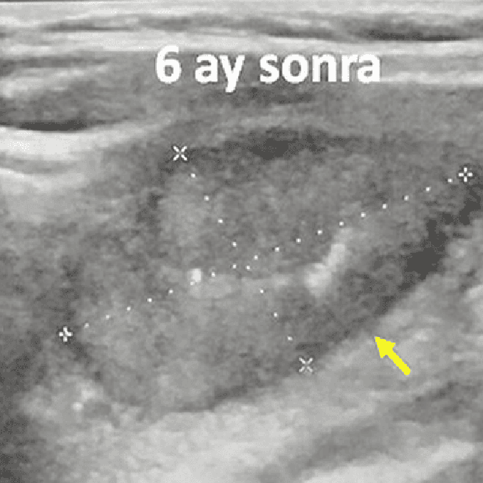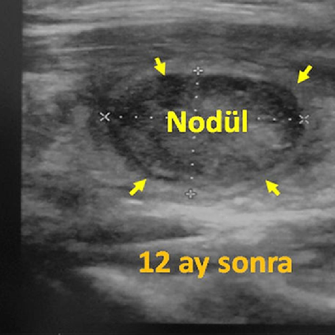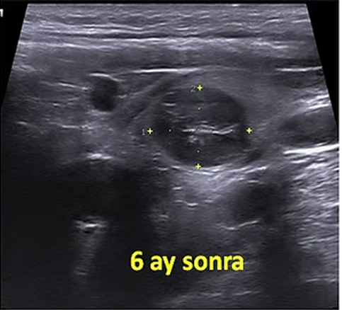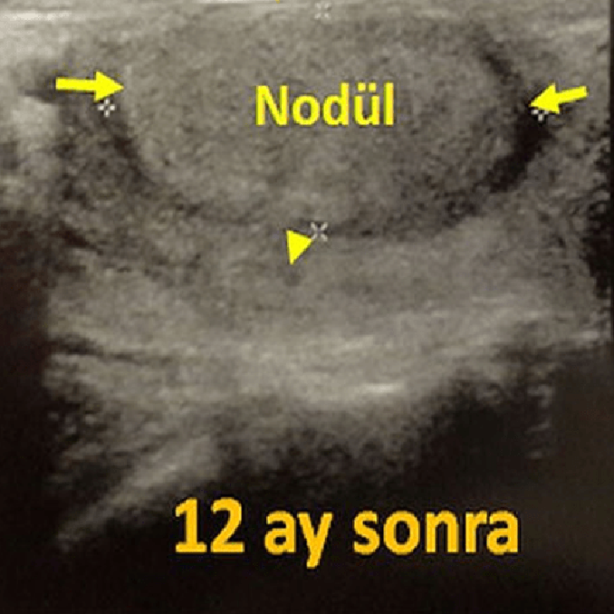 Tiroid sol lobunda 67 mm çaplı solid nodülü olan 34 yaşında kadın hastamızda nodüle radyofrekans ablasyon uygulandı. Nodülün maksimum çapı 3. ayda 43 mm ye indi. İlave alkol ablasyonundan sonra, 6. ayda nodülün çapının 20 mm ye indiği izlenmiştir (hacimsel olarak % 90’dan fazla azalma). Hastada şikayetler kaybolmuş ve boyun görünümü normale dönmüştür.