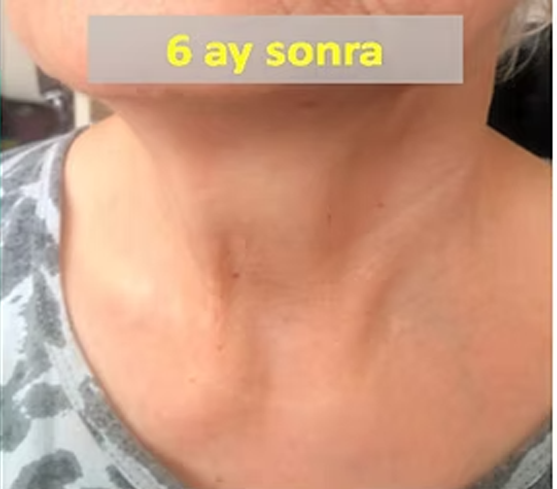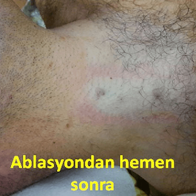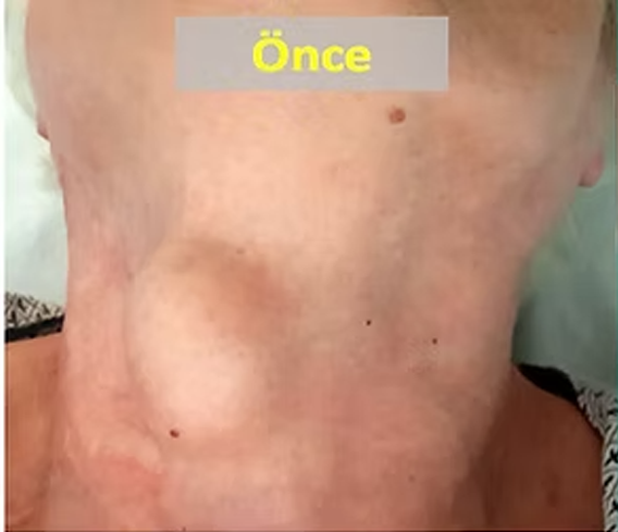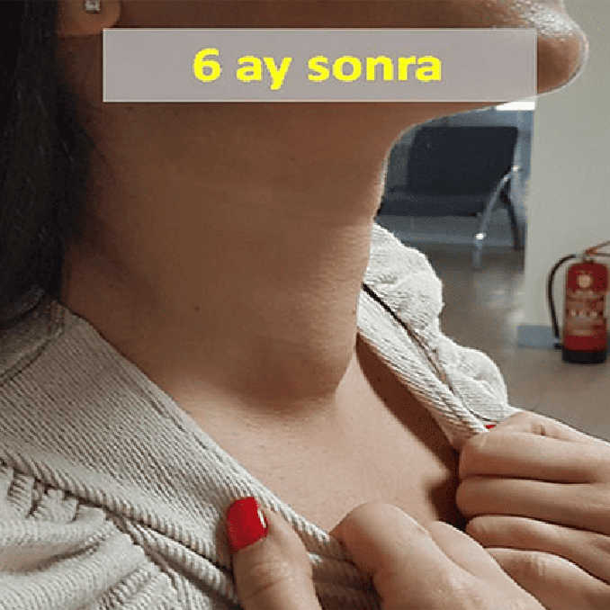 Tiroid bezi istmus bölgesinde tek, büyük (53x45x47 mm) solid nodülü olan hastamızda perkütan radyofrekans ablasyonu yapıldı. Altıncı ay kontrol ultrasonunda, tedavi edilen tiroid nodülünde hacimsel olarak % 80’in üzerinde azalma olmuş ve boynun görünüşü normale dönmüştür.