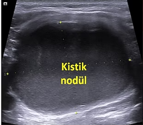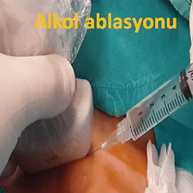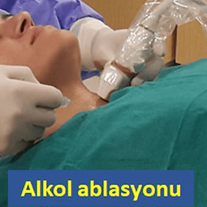 Sağ tiroid lobunda 62X50X47 mm boyutlarında yarı solid nodülü olan 32 yaşındaki erkek hastamızda nodüle 3 ay ara ile 2 kez ultrason eşliğinde alkol ablasyonu uygulandı. İlk ablasyondan bir yıl sonra, ultrasonda nodülün hacminde %90 azalma görülmüştür.