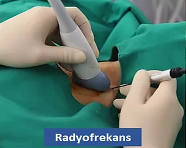 Tiroid sağ lobunda 4 cm çaplı iyi huylu nodülü olan 72 yaşında bayan hastada nodüle radyofrekans ablasyon uygulanıyor. Hastanın sol tiroid lobu 20 yıl önce opere edilmiştir. Tedaviden 6 ay sonra, ultrasonda nodülün hacmi %90 oranında azalmış ve hastanın boynunun görünümü tamamen normalleşmiştir.