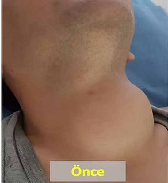 Boynunda dışa doğru büyüyen dev guatr sorunu olan 41 yaşındaki erkek hastamızda, önce anjiografi tekniğiyle embolizasyon yapılarak guatr dokusunu besleyen damarlar tıkanıyor. Daha sonra da 2 kez alkol ablasyonu yapılıyor. Bir yıl sonra boyundaki guatr kitlesinin %90’dan fazla küçüldüğü izleniyor. Bu tür hastalarda, guatrdaki küçülme sonraki yıllarda da devam etmektedir.