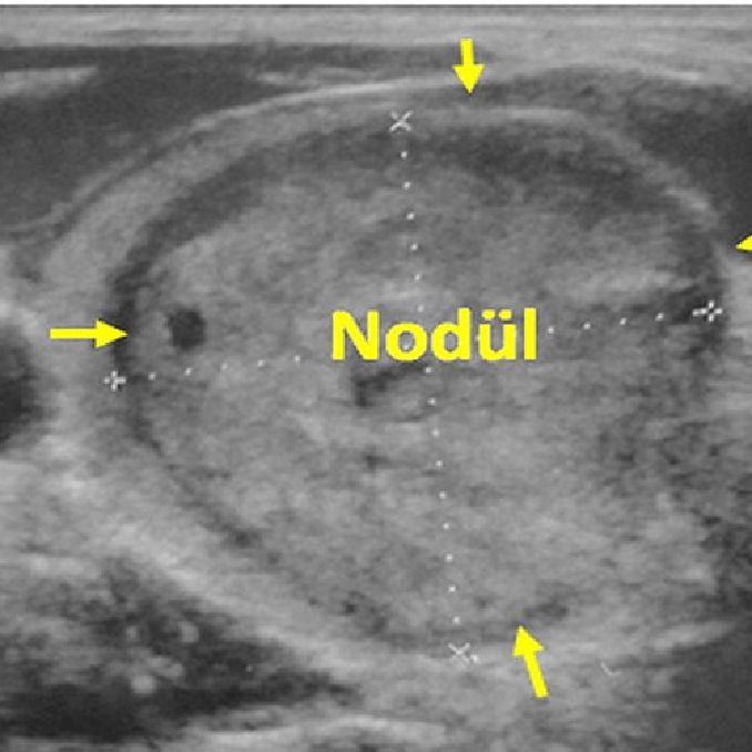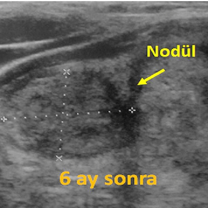 Bir hipertiroidi hastamızda, tiroid sağ lobundaki 33x28x27 mm boyutlarındaki nodüle ultrason rehberliğinde lazer ablasyonu yapılıyor. İşlemden 6 ay sonra çekilen kontrol ultrasonunda kitlenin hacimsel olarak yaklaşık %76 oranında küçüldüğü izleniyor. Hastanın yakınmaları geçmiş ve hormon seviyeleri halen normal olarak takip edilmektedir